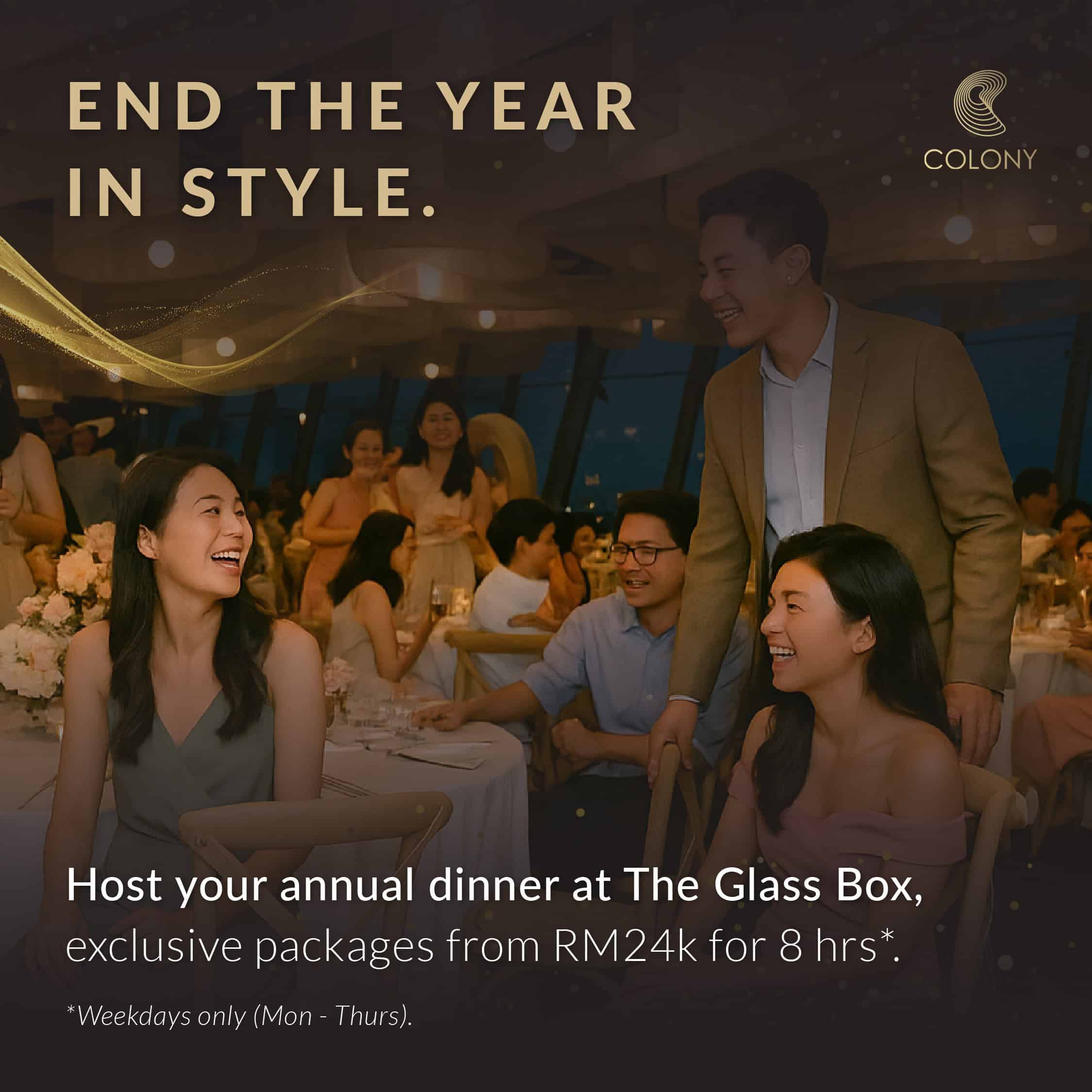 At Colony's iconic Glass Box venue, where rooftop views and refined dining create an unforgettable celebration.